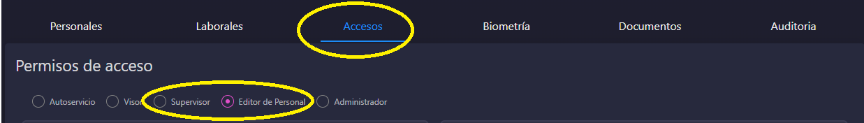 1.- Ingresa al perfil del colaborador que deseas asignar como supervisor, nos dirigimos a Accesos y verifica que cuente con los permisos correspondientes (ya sea como supervisor o como editor de personal). (FIG 1.1)