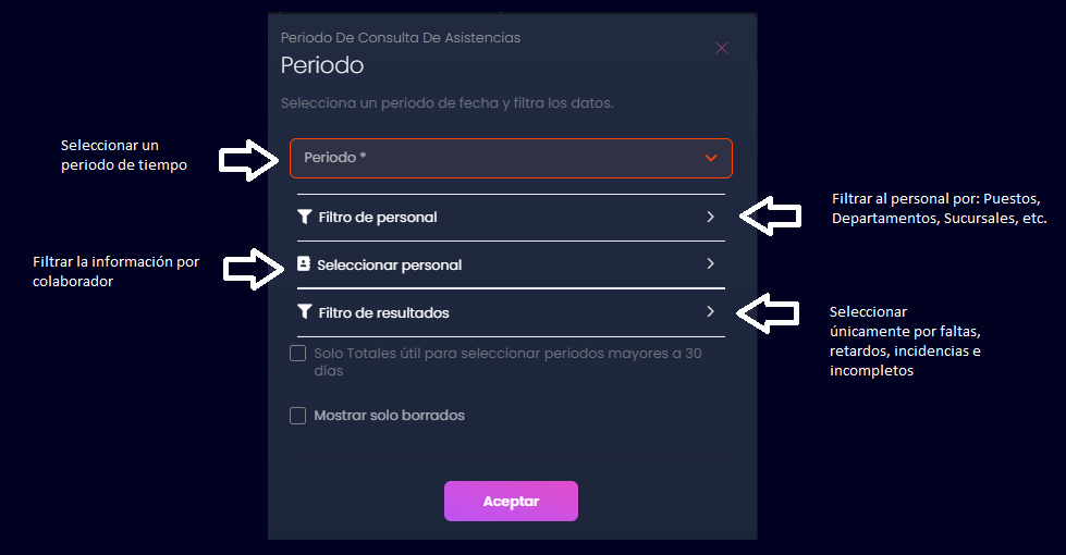 - Una vez en el listado de asistencias, nos abrirá una ventana para poder: seleccionar un periodo de tiempo, filtrar al personal, y filtros de incidencias, como se muestra en la siguiente imagen.