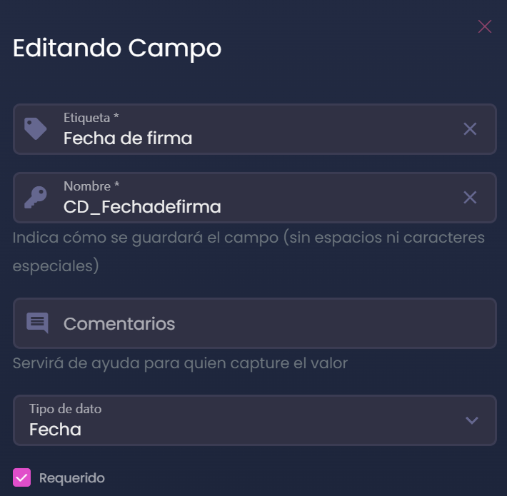 5.En el campo nombre colocaremos la llave "CD_Fechadefirma", con la que reconocerá este campo.