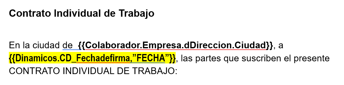 Por ejemplo: {{Colaborador.FechaIngreso,” FECHA”}}. Aparece con fecha. Ej. 18 de mayo del 2022.