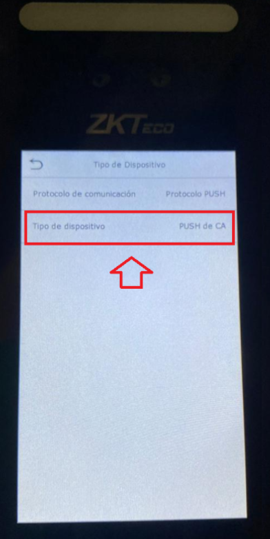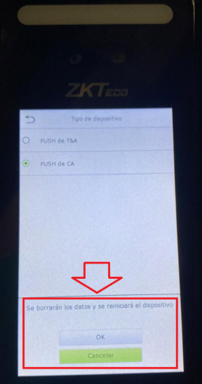 4.- En esta opcion vamos hacer el cambio, por default los checadores ya vienen con la opcion de "Control de acceso" y tenemos que modificarlo a "Push de T&A" (significa tiempo y asistencia)